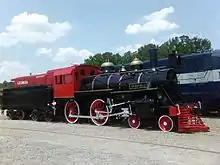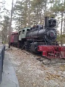 - #110, The Yonah II - a former McRae Lumber & Manufacturing 2-6-2 steam locomotive built by the Vulcan Iron Works in 1927. The engine went to the Beechwood Band Mill in Cordele, Georgia, in 1930 before being sold in 1933 to the Cliffside Railroad.[4] The Cliffside retired the engine when the road dieselized in 1962,[5] and sold it the following year to the Swamp Rabbit Railroad in Cleveland, South Carolina, who sold the engine to Stone Mountain in 1969.[6] First steam locomotive to be withdrawn from active service, having encountered running gear issues in 1982. Placed on display at the Memorial Depot in 1984. The Stone Mountain Memorial Association donated the engine to the New Hope Valley Railway in Bonsal, North Carolina in 2012, and the engine was moved to the railway in early February 2013. The New Hope Valley intends to restore the engine to operating condition, which is anticipated to take five to seven years at an estimated cost of $600,000 based on an initial survey of the engine performed in 2012. The engine was given a cosmetic restoration and placed on display, while the railway continues to evaluate the engine's components and raise funds for operation.