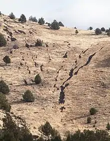 A stone stripe, also called a lava stringer,[1] is an elongated concentration of mostly talus-like basalt rock found along a hillside or the base of a cliff. Many stone stripes occur without cliffs. A stone stripe is identified by its lack of vegetative cover. They typically occur in north central Oregon and develop at 900 to 1,100 meter elevations. Lengths can range from only a few meters to over 150 meters, and widths measure from .3 to 3 meters. Depths of the stone stripes range from 20-65 centimeters.[2]
