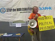 StWC were among many groups campaigning against the incarceration of former Australian Guantánamo detainees, David Hicks[8] and Mamdouh Habib,[9] who were held without trial by the US, as well as supporting the campaigns for Joseph "Jack" Thomas who was the first Australian charged under the Anti-Terrorism Laws and Dr Mohamed Haneef, an Indian doctor charged over a collapsed terrorism plot in the UK, subsequently having his Australian working visa cancelled by former Minister for Immigration, Kevin Andrews.[10] StWC accuse the Australian Government of leading "anti-Arabic racism" and "anti-Muslim attacks", which they argue are a pretext for these case examples. After the Cronulla race riots of 2005, StWC convener Pip Hinman likened the political climate to that of the anti-Asian racism during the period of the White Australia Policy, blaming the Government for the riots and accusing them of overshadowing the Right Wing political platform of the former One Nation leader, Pauline Hanson, in the 1990s.[11]