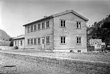 Like the other stations along the Sørlandet Line, the station building received a standardized design. It was built in the overall Neoclassical architecture style adapted in the 1920s. By the 1940s the designs had been altered to include elements of Functionalism.[3] The station building, designed by Gudmund Hoel, was identical to the one at Audnedal Station. The 180 square meters (1,900 sq ft) building is wooden with a concrete foundation. It has siding in wood and a gable roof. The building consists of a main section, where the lower story originally featured a ticketing and waiting room, and an upper story with the station master's residence. The annex was allocated cargo handling.[4]