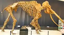 Finds located particularly far to the north are documented not only from individual remains from Mecklenburg-Western Pomerania and Lower Saxony.[27] Fossils of at least ten P. antiquus have been found in the Schöningen opencast mine since the excavations began in the 1980s. These were individual finds of ribs, tusks or vertebrae that had to be hurriedly recovered from the approaching bucket wheel excavator during rescue excavations.[28] The P. antiquus discovered in 2017 is the only almost completely preserved skeleton. Since the site is in the open-cast mining area on the preserved spear base, the recovery took place without time pressure in close consultation with the conservation workshop of the Lower Saxony State Office for Monument Preservation.[29] Further analyzes of the environmental and climatic conditions at the time of death of the animal, as well as the sedimentation processes of the former lake, are carried out by the Technical University of Braunschweig, the University of Lüneburg and the University of Leiden in the Netherlands. These sediment samples were analyzed for micro-fauna, micro-morphology, Limnology and Paleobotany.[30] The 300,000 year-old nearly entire remains of a female straight-tusked elephant were revealed by University of Tübingen researchers and the Senckenberg Centre for Human Evolution in May in 2020 in Schöningen in Germany. According to the archaeozoologist Ivo Verheijen, 6.8 tones older skeleton with battered teeth had a shoulder height of about 3.2 metres. Researchers also uncovered two long bones and 30 small flint flakes were used as tools for knapping among the elephant bones. “We found both 2.3-m-long tusks, the complete lower jaw, numerous vertebrae and ribs as well as large bones belonging to three of the legs and even all five delicate hyoid bones,” said an archaeologist Dr. Jordi Serangeli.[31][32][33] The P. antiquus is probably a female with a shoulder height of approximately 3.2 m (10 ft) and weight around 6.8 tons. During the excavation, 300 bones and a total of 700 bone parts were recovered, spread over an area of around 64 m2 (690 sq ft). The finds include the 2.3 meter long tusks, the lower jaw, vertebrae and ribs, as well as the bones of three legs and the entire hyoid bone.[34] The skeletal parts were largely in an anatomically correct arrangement. Various parts were missing, such as the pelvis, the left front leg with the shoulder blade and the foot bones of two legs. The preservation of the bones is mostly very good, only the more than one meter high skull of the individual had disintegrated into hundreds of small parts. This was caused by the comparatively light construction of the skull, which, like all elephants, consists of numerous air-filled and honeycomb-like hollow chambers. Overall, the animal lay parallel to the former lake shore with the head in the north and the rear in the south. The age of the animal is estimated to be around 50 years due to the worn teeth and osteoarthritis of the bones.[35]