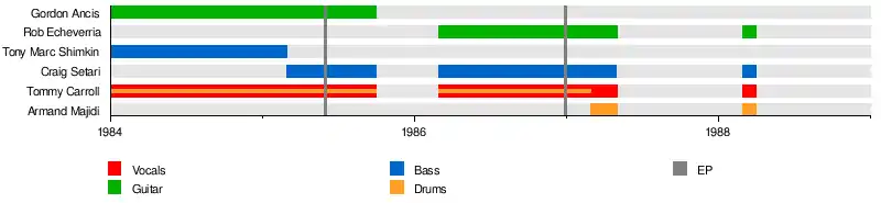 - Tommy Carroll – lead vocals (1984–1985; 1986–1987; 1988), drums (1984–1985; 1986–1987)