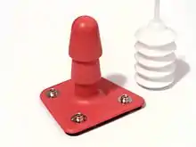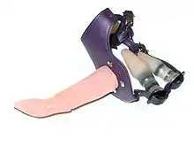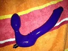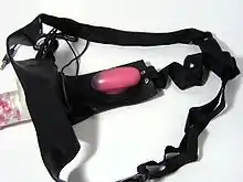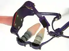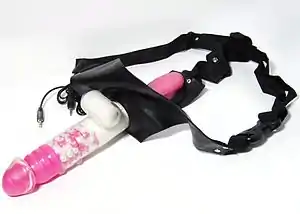 A strap-on dildo (also strap-on) is a dildo designed to be worn, usually with a harness, during sexual activity.[1] Harnesses and dildos are made in a wide variety of styles, with variations in how the harness fits the wearer, how the dildo attaches to the harness, as well as various features intended to facilitate stimulation of the wearer or a sexual partner.[2][3][4] Strap-on dildos are most frequently used by lesbian women (or women who have sex with women), but can be used by people of any gender or sexuality.[2]