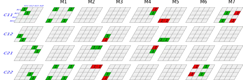 With this construction we have not reduced the number of multiplications. We still need 8 multiplications of matrix blocks to calculate the matrices, the same number of multiplications we need when using standard matrix multiplication.