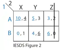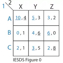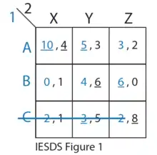 - Of the remaining strategies (see IESDS Figure 2), Z is strictly dominated by Y and X for Player 2. Therefore, Player 2 will never play strategy Z. Player 1 knows this.