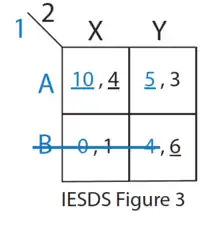 - Of the remaining strategies (see IESDS Figure 3), B is strictly dominated by A for Player 1. Therefore, Player 1 will never play B. Player 2 knows this.