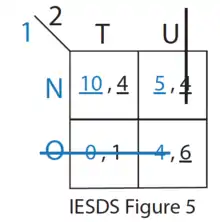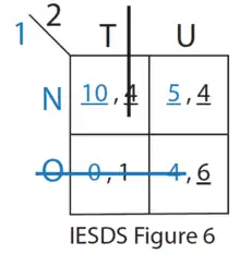 - O is strictly dominated by N for Player 1. Therefore, Player 1 will never play strategy O. Player 2 knows this. (see IESDS Figure 5)
