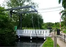 By the late 1930s the southern section had become derelict, although a water supply was maintained, which the GWR used to supply its engine shed in Stratford. The northern section was never officially closed, but traffic had virtually ceased by 1939. It was blocked when bridge no. 2, the Tunnel Lane lift bridge at Lifford, became faulty, and was replaced by the GWR with a fixed bridge which left insufficient height for a boat to pass.[16] After Lord Methuen raised the issue in the House of Lords in 1947, and was assured that the bridge "would be lifted at any time on notice of intended passage being given", Tom Rolt of the Inland Waterways Association (IWA) announced that he intended to pass under the bridge on 20 May 1947. Despite difficulties with the state of the canal, and the fact that the accompanying boat provided by the GWR got stuck, the bridge was reached. It had been jacked up and was resting on heavy timbers.[4] Robert Aickman, another of the founders of the IWA, had organised press coverage, and the story was reported in the national newspapers. IWA members were then encouraged to use the route.[16] Eric de Mare repeated the exercise in 1948, using a converted army pontoon. A horse-drawn ice breaker was used to create a channel through the weed on this occasion,[4] and the following year, Peter Scott asked for the bridge to be lifted. In 1950, the bridge, which had become known as Lifford Bridge, or Lifford Lane Bridge, was replaced with a working swing bridge.[16] The northern section of the canal was saved from dereliction by such pioneering efforts.[4] The bridge has now been removed altogether.