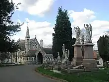 Under the Metropolitan Burial Act of 1852, which followed the second cholera epidemic of 1848–49, the Streatham Burial Board acquired the land for a cemetery in what was countryside at the time. The cemetery opened for burials in 1894 and was provided with two lodges and two mirror-image chapels built in the Gothic style by William Newton Dunn.[2] The cemetery was subjected to extensive "lawn conversion" from 1969 to 1991 and many monuments were removed. No new graves are available in the cemetery but burial in existing family plots is allowed.[3]