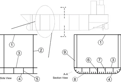 The depicted hull is a sample small double bottom (but not double hull) oil tanker.
