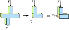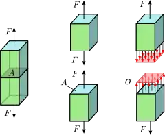 Another simple type of stress occurs when a uniformly thick layer of elastic material like glue or rubber is firmly attached to two stiff bodies that are pulled in opposite directions by forces parallel to the layer; or a section of a soft metal bar that is being cut by the jaws of a scissors-like tool. Let F be the magnitude of those forces, and M be the midplane of that layer. Just as in the normal stress case, the part of the layer on one side of M must pull the other part with the same force F. Assuming that the direction of the forces is known, the stress across M can be expressed simply by the single number , calculated simply with the magnitude of those forces, F and the cross sectional area, A.