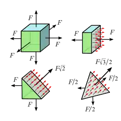 Quantitatively, the stress is expressed by the Cauchy traction vector T defined as the traction force F between adjacent parts of the material across an imaginary separating surface S, divided by the area of S.[5]: p.41–50 In a fluid at rest the force is perpendicular to the surface, and is the familiar pressure. In a solid, or in a flow of viscous liquid, the force F may not be perpendicular to S; hence the stress across a surface must be regarded a vector quantity, not a scalar. Moreover, the direction and magnitude generally depend on the orientation of S. Thus the stress state of the material must be described by a tensor, called the (Cauchy) stress tensor; which is a linear function that relates the normal vector n of a surface S to the traction vector T across S. With respect to any chosen coordinate system, the Cauchy stress tensor can be represented as a symmetric matrix of 3×3 real numbers. Even within a homogeneous body, the stress tensor may vary from place to place, and may change over time; therefore, the stress within a material is, in general, a time-varying tensor field.
