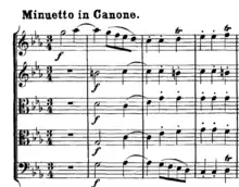 The Menuetto is a canon in which the violin enters first, with the cello following at an interval of one bar.