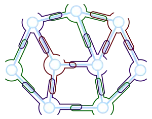 Every planar graph is a string graph:[3] one may form a string graph representation of an arbitrary plane-embedded graph by drawing a string for each vertex that loops around the vertex and around the midpoint of each adjacent edge, as shown in the figure. For any edge uv of the graph, the strings for u and v cross each other twice near the midpoint of uv, and there are no other crossings, so the pairs of strings that cross represent exactly the adjacent pairs of vertices of the original planar graph. Alternatively, by the circle packing theorem, any planar graph may be represented as a collection of circles, any two of which cross if and only if the corresponding vertices are adjacent; these circles (with a starting and ending point chosen to turn them into open curves) provide a string graph representation of the given planar graph. Chalopin, Gonçalves & Ochem (2007) proved that every planar graph has a string representation in which each pair of strings has at most one crossing point, unlike the representations described above. Scheinerman's conjecture, now proven, is the even stronger statement that every planar graph may be represented by the intersection graph of straight line segments, a very special case of strings.