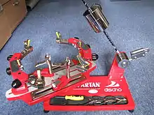 Drop weight stringing machines are inexpensive that use a weighted bar to achieve the desired string tension. Using only weight and simple laws of physics (torque = force x distance) they are very precise and also constant pull type of machines.[1] They are the most maintenance-free type of machines and also the most affordable. [2] As a result, these stringing machines are popular among those learning how to string a racquet or string on a casual basis. On the other hand, slow tensioning times are the main reason for stringers choosing more expensive machines.