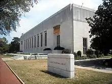 Among American architects, the work of Paul Philippe Cret exemplifies the style. His Château-Thierry American Monument built in 1928 has been identified as an early example.[16] Among his other works identified with the style are the exterior of the 1933 Folger Shakespeare Library in Washington, D.C. (though not the Tudor Revival library interior), the 1937 University of Texas at Austin's Main Tower, the 1937 Federal Reserve Building in Washington, D.C. and the 1939 Bethesda Naval Hospital tower.[16][17][18]