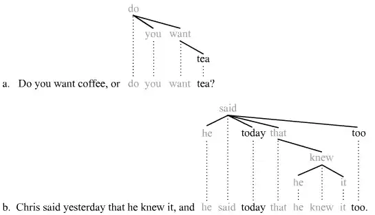 Another avenue to explore for an explanation is to focus on the elided material (as opposed to on the remnant). In most cases, the elided material cannot be characterized as a constituent. It can, however, be characterized as a catena.[8] The following dependency grammar trees illustrate this explanation in terms of catenae. The elided material is indicated with a lighter font shade:[9]