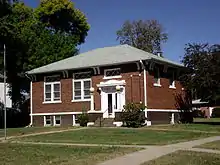 Stromsburg was settled early in Nebraska history. A group of Swedish settlers coming from the town of Ockelbo arrived in the 1860s after several years in Illinois. This group had a leader named Lewis Headstrom, who was a real estate agent. Seeing some similarities to their old Swedish homeland the settlers formed what would be called Stromsburg, named after a section of Ockelbo, Sweden.[6] By the 1880s two brickyards were in operation in the town. Many buildings from ‘native’ brick still stand, including the Viking Center, now a community center that was originally The Opera House; the Cornerstone Bank; two businesses on the east side of the square; and several homes. Brick streets still surround the city square in Stromsburg. A brick Carnegie library was built in Stromsburg in 1918. The downtown area of Stromsburg has a town square in its center. This square forms a park, with lawns and mature trees, where festivals and events are held. In the center of the square is a two-story Swedish style building made of brick with decorative toll painting and the phrase "Välkommen" (Swedish for "Welcome").