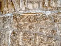 The army (Latin: legio) consisted, according to Livy, of exactly 3,000 infantry and 300 horsemen, one third from each of Rome's three founding tribes.[lower-alpha 1][6] Warriors served under six "leaders of division" (Latin: tribuni) who in turn served under a general, usually in the person of the reigning King. Mommsen uses philological arguments and references from Livy and others to suggest that the greater mass of foot-soldiers probably consisted of pilumni (javelin-throwers), with a smaller number possibly serving as arquites (archers).[7] The cavalry was far smaller in number and probably consisted solely of the town's richest citizens.[8] The army may also have contained the earliest form of chariots,[9] hinted at by references to the flexuntes ("the wheelers").[10]