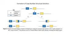 There are several structural variants in the human genome that have been observed but have not led to any obvious phenotypic effects.[1] There are some, however, that play a role in gene dosage which could lead to genetic diseases or distinct phenotypes. Structural variants can directly affect gene expression, such as with copy-number variants, or indirectly through position effects.[1] These effects can have significant implications in susceptibility to disease. The first gene dosage effect that was observed, and considered to be an autosomal dominant disease from an inherited DNA rearrangement, was Charcot-Marie Tooth (CMT) disease. Most of the associations found with CMT were with a 1.5 Mb tandem duplication in 17p11.2-p12 at the PMP22 gene.[11] The proposed mechanism for the structural variation is shown in Figure 2. When an individual has three copies of the normal gene, it results in the disease phenotype.[11] If the individual had only one copy of the PMP22 gene, on the other hand, the result was a clinically different heredity neuropathy with liability to pressure palsies.[11] The differences in gene dosage created vastly different disease phenotypes which revealed the significant role that structural variation has on phenotype and susceptibility to disease.