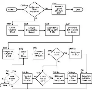 A structure chart is also used to diagram associated elements that comprise a run stream or thread. It is often developed as a hierarchical diagram, but other representations are allowable. The representation must describe the breakdown of the configuration system into subsystems and the lowest manageable level. An accurate and complete structure chart is the key to the determination of the configuration items (CI), and a visual representation of the configuration system and the internal interfaces among its CIs(define CI clearly). During the configuration control process, the structure chart is used to identify CIs and their associated artifacts that a proposed change may impact.[2]