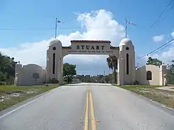 The Stuart Welcome Arch (also known as the 1926 Welcome Arch or Rio-Jensen Beach Arch) is an historic arch-shaped structure which straddles County Road 707 between 2369 and 2390 Northeast Dixie Highway in Jensen Beach, Florida. It was built in 1926 to mark what was then the town line between the town of Jensen to the north and the town of Stuart to the south. During the Great Depression, the town of Jensen went bankrupt and was dissolved, while the town (now City) of Stuart was forced to relinquish much of its territory north of the St. Lucie River. Today it is located entirely within the unincorporated area of Martin County. It has been restored several times over the years. On September 15, 2004, it was added to the U.S. National Register of Historic Places.