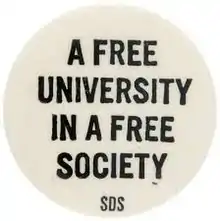 By the fall of 1965, largely under SDS impetus, there were several "free universities" in operation: in Berkeley, SDS reopened the New School offering "'Marx and Freud,' 'A Radical Approach to Science,' 'Agencies of Social Change and the New Movements'; in Gainesville, a Free University of Florida was established, and even incorporated; in New York, a Free University was begun in Greenwich Village, offering no fewer than forty-four courses ('Marxist Approaches to the Avant-garde Arts,' 'Ethics and Revolution,' 'Life in Mainland China Today"); and in Chicago, something called simply [']The School['] began with ten courses ('Neighborhood Organization and Nonviolence,' 'Purposes of Revolution')." By the end of 1966 there were perhaps fifteen. (So serious was the challenge, that universities soon began to offer seminars run on similar student-responsive lines, and a "liberal swallow-up" began).[36]