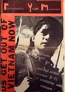 Like the PLP-WSA, this Revolutionary Youth Movement (RYM) faction was committed to an anti-capitalist analysis that privileged the working class. But RYM made at least two concessions to the broader spirit of the times. First it outbid the PLP-WSA in accommodating black and ethnic mobilization by embracing the legitimacy within "the class" of "Third World nationalisms." "Oppressed colonies" in the United States had the right "to self-determination (including the right to political secession if they desire it)"[66] Second, as a youth movement, the RYM allowed that—if only in solidarity with others of their generation—students could have some agency.
