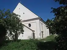 The rectangular building is made of massive walls with simple Baroque windows and has a saddleback roof. An external staircase, attached diagonally to the western facade, gives access to the women's gallery. Several oval ventilation openings in the gable are typical for the local architecture of the region.