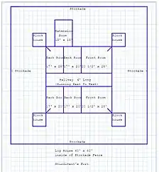 "We found that the log house in the center of the fort was approximately 60' x 60'. In comparison, the Old Slave House in Gallatin County [Illinois] is 50' x 50'. There were six rooms, three on each side, separated by a 4' hallway running east and west. The front two rooms, facing the river, measured 20 1/2' x 28'. The back four rooms were of equal size and measured 17' x 28'. There was an extension on the northwest corner of the house, 18' x 18'. Extending from the corners of the log house were four corridors approximately 100' long, evidently leading to the corner blockhouses. There was a palisade surrounding the perimeter of the house. There was also an outer perimeter palisade encompassing the entire property. From documents, we know that the house was 1 1/2 to 2 stories high."[43]