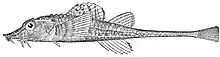 The sturgeon poacher (Podothecus accipenserinus, also known as the sturgeon-like sea-poacher in Canada[3]) is a fish in the family Agonidae (poachers).[4] It was described by Wilhelm Gottlieb Tilesius von Tilenau in 1813. It is a marine, temperate water-dwelling fish which is known from the northern Pacific Ocean, including the western Bering Sea, Cape Navarin, the Commander Islands, the Sea of Okhotsk, the Aleutian Islands, and northern California, USA. It dwells at a depth range of 2 to 710 metres (6.6 to 2,329.4 ft), and inhabits soft benthic sediments. Males can reach a maximum total length of 30.5 centimetres (12.0 in).[4]
