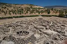 A village, intended to accommodate the surrounding population, was built around the Nuraghe in the Late Bronze Age. The many phases of life in the village render it impossible to establish the number of huts in one phase, the number of huts varied from forty to two hundreds, so the population ranged from 100 to 1000 inhabitants[1] and the settlement was built on a circular plan with large boulders covered with dry stone walls and conical roofs made of wood and branches. Though the huts were structured in a single unit in more remote periods, there was a later, more prevalent tendency to subdivide housing into individual units. Of the huts found, the most significant appear to have been reserved for meetings of the local leaders. These huts were larger and more complex in structure, and the hut reserved for the inhabitants' meetings contained symbols of the deities worshiped by locals. Other rooms have been identified as workshops, kitchens, and agricultural processing centres. During the 9-8th century bc a sewerage system was built along with a paved square and streets.[2]