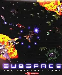 SubSpace is a 2D space shooter video game created in 1995 and released in 1997 by Virgin Interactive[1] which was a finalist for the Academy of Interactive Arts & Sciences Online Game of the Year Award in 1998.[2] SubSpace incorporates quasi-realistic zero-friction physics into a massively multiplayer online game.[3] It is no longer operated by VIE; instead, fans and players of the game provide servers and technical updates.[4] The action is viewed from above, which presents challenges very different from those of a three-dimensional game. The game has no built-in story or set of goals; players may enter a variety of servers, each of which have differing objectives, maps, sounds, and graphics.
