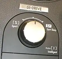 SI-Drive, or Subaru Intelligent-Drive,[13] (Japanese: SI-Drive) is standard equipment on all trim versions. It is a feature that enables three distinctly different modes of vehicle performance characteristics (identified as "Sport", "Sport Sharp", and "Intelligent") by regulating the engine control unit (ECU), the automatic transmission control unit (TCU, if equipped), and by fine-tuning the electronically controlled throttle. The SI-Drive control knob is installed on the center console between the heated front seat control switches. The "Intelligent" mode makes throttle response more gradual, and decreases maximum engine power by 10 percent. The "Sport" mode allows the engine to run at higher speeds and increases fuel efficiency by 5 percent in comparison to Subaru engines without the feature. The "Sport # (Sharp)" mode makes throttle response more abrupt and enables the automatic transmission to maintain higher RPMs within a given gear's range, and minimizes the electric power steering wheel effort. When the engine is started, the default setting is the "Sport" selection.