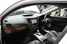 A smart key is available as an option coupled with two position memory seat that memorizes driver's seat positions and adjustments, exterior mirror adjustments, and climate control settings. The settings can be customized based on the smart key module being used to unlock and start the car. Turn signal repeaters are still integrated into the side exterior mirrors on all Japanese-spec models. The black leather interior installed on vehicles with the "S" package can be fitted with optional black corduroy inserts with white contrasting French stitching on all visible seams and aluminum cross drilled brake, clutch and accelerator pedals. The Legacy wagon can be fitted with twin white LED lights installed on the interior hatch vertically surrounding the rear window with a separate light switch for additional illumination when the rear hatch is open.[6] An optional LED accessory lighting package in either white or blue can be installed for the front and rear passenger footwells and a matching illuminated sill panel for the front and rear doors, and the standard overhead dome light can be exchanged for white LED as well.