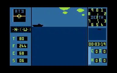 The game opens displaying the control console, whose square middle section shows a map of the Mediterranean with your current location displayed as a white cross and the locations of enemy ships as black dots.[5] Various status details are shown in the two rectangular areas on either side of the map.[6] Forward movement is controlled by the number keys, 1 for slow and 9 for maximum. On the surface the submarine moves more rapidly and recharges its batteries and air supply. The joystick provide directional control through the rudders and dive planes. This is a slow process, turning the ship right around in a 360 degree circle takes considerable time even at full speed.[7]