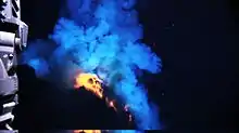 At shallow depths it is common for submarine eruptions to be explosive due to the reaction between volatiles in the magma and water which generates a significant quantity of steam.[7] These eruptions described as Surtseyan are characterised by large quantities of steam and gas and creating large amounts of pumice.[8] This activity has occurred in many locations. An example is Fukuto-Okanoba near Japan. This activity has been observed for almost a century and causes discoloured water, jets of steam and ash, and pumice is found floating in the surrounding water.[9]