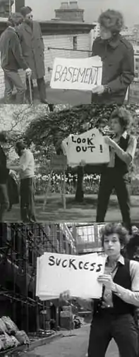 "Subterranean Homesick Blues" is a song by Bob Dylan, recorded on January 14, 1965, and released as a single by Columbia Records, catalogue number 43242, on March 8.[4] It was the lead track on the album Bringing It All Back Home, released some two weeks later.[5] It was Dylan's first Top 40 hit in the United States, peaking at number 39 on the Billboard Hot 100. It also entered the Top 10 of the UK Singles Chart. The song has subsequently been reissued on numerous compilations, the first being the 1967 singles compilation Bob Dylan's Greatest Hits. One of Dylan's first electric recordings, "Subterranean Homesick Blues" is also notable for its innovative film clip, which first appeared in D. A. Pennebaker's documentary Dont Look Back. An acoustic version of the song, recorded the day before the single, was released on The Bootleg Series Volumes 1–3 (Rare & Unreleased) 1961–1991.