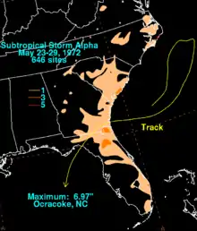 Subtropical Storm Alpha (also called Alfa) was an off-season subtropical cyclone that hit Georgia in May 1972. It developed from a previously non-tropical cyclone in the western Atlantic Ocean, and initially it moved northeastward off the Carolinas. The storm turned southwestward due to a building ridge, and concurrently it intensified to become Subtropical Storm Alpha. It later moved ashore near Savannah, and it finally dissipated in the northeast Gulf of Mexico on May 29. It produced wave action and moderate rainfall along the coast. Damage totaled over $100,000 (1972 USD), and there were two associated deaths.