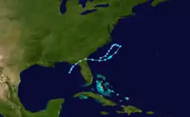 While the storm was traveling over the western Atlantic Ocean, the storm produced a large area of rough seas, which was considered the greatest threat from the storm.[19] In northeastern Florida, police officers were stationed to ensure people did not swim in the dangerous seas. The high waves also halted work to deepen a harbor at the Mayport Naval Station.[20] Two people drowned after the storm dissipated, when surf was still turbulent.[21] Tides along the Georgia coast reached 2 to 3 feet (0.61 to 0.91 m) above normal, which caused some flooding and beach erosion.[18][22] Wind gusts reached 58 mph (93 km/h) on Saint Simons Island.[23] The winds knocked down trees and power lines, leaving some people without power in eastern Georgia. Damage was minor but widespread in the state, estimated at over $50,000 (1972 USD).[18] Moderate rains spread in coastal areas from South Carolina through southern Florida.[17]
