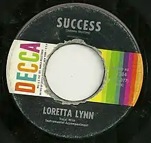 "Success" was released as a single via Decca Records in April 1962.[4] The single spent a total of 16 weeks on the Billboard Hot Country Western and Sides chart before peaking at number six in September.[5] Although Lynn's first hit had been 1960's "I'm a Honky Tonk Girl," it was "Success" that became Lynn's first top ten hit in her career. The single ultimately started a series of top ten hits for Lynn during the decade. This would be followed by number one singles as well.[2] In 1963, the song was issued on Lynn's debut studio album entitled Loretta Lynn Sings, also on Decca.[3]