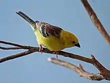 The Sudan golden sparrow (Passer luteus) is a small species of bird in the sparrow family found in sub-Saharan Africa. It is a famous cage bird, and in aviculture, it is known as the golden song sparrow. The Arabian golden sparrow and this species are sometimes considered one species, as the "golden sparrow."