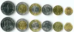 In 1956, coins were introduced in denominations of 1, 2, 5 and 10 millim, 2pt, 5pt and 10pt. The millim denominations were struck in bronze, whilst the qirush denominations were in cupro-nickel. The 2, 5 and 10 millim were scallop shaped, although a round 5 millim was introduced in 1971. The 1 and 2 millim were last struck in 1969, the last 5 millim in 1978. In 1983, brass 1pt, 2pt and 5pt, a reduced size 10pt and a cupro-nickel 20pt were introduced. In 1987, aluminium-bronze 1pt, 5pt, 10pt, 20pt, 25pt and 50pt and £S.1 were introduced, with the 25 and 50 qirush square and octagonal in shape, respectively. In 1989, stainless-steel 25pt and 50pt and £S.1 were issued. This is the general pattern, in addition to these coins there are collector-oriented issues and various oddities. See popular coin catalogues for details.
