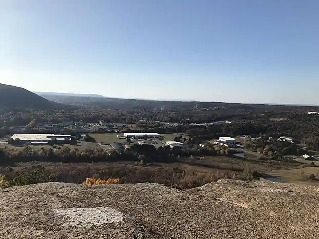 This popular climbing destination rises 690 feet (210 m) above the fertile valley just east of the city of Heber Springs. It formed as an erosional remnant by the Little Red River (Arkansas). It stands as a monument to the eons of time when the river was patiently carving out the valley from the surrounding hills. Why the sandstone formation has held firm on top of the long familiar landmark is a question that geologists can explain. Because the huge rocks at the top of the formation lie in flat layers and were not folded by continental drift, they cap the mountain on which they lie. Through the centuries, less resistant units of sandstone, siltstone and shale eroded away, leaving the atoka formation which the white man called Sugar Loaf.