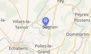 Sugnens railway station (French: Gare de Sugnens) is a railway station in the municipality of Montilliez, in the Swiss canton of Vaud. It is located on the 1,000 mm (3 ft 3+3⁄8 in) Lausanne–Bercher line of the Chemin de fer Lausanne-Échallens-Bercher (LEB).[1]