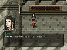 Suikoden II is a role-playing video game with strategic elements covering those gameplay options pertaining to large scale confrontations, such as between two armies. The player controls a silent protagonist and travels with him around the world map, advancing the plot by completing tasks and talking with other characters. The player can also recruit new characters to his cause, often involving a short sidequest to do so. In towns, the player can gather information, sharpen characters' weaponry, and buy equipment; wilderness areas generally feature random encounters with monsters.