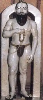 The last stanza praises Ganesha as One who with a pot belly, who wears yellow silken garments. His pot belly is interpreted to have grown his favourite sweet modaks as well as the sins of his devotees, thus absolving them.[6] A serpent is around his waist. He has three eyes and a soft trunk. His third eye is interpreted to the source of knowledge. Lokprabha notes that the third eye, usually not depicted in Ganesha's iconography, is seen in the Ganesha of Morgaon.[6] He is called Vakratunda, "One with a curved trunk".[3][5] Another translation of the word means one who destroys the crooked.[6] In the second last line, the poet's name is given: "Your humble servant Ramadas waits for you to come". Further, the song requests Ganesha, the Lord who worshipped by all, to be pleased with the devotee in trouble and protect him in distress. The chorus is repeated.[3][5]