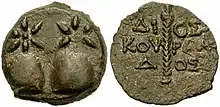 Although the sea made serious inroads upon the territory of Dioscurias, it continued to flourish and became one of the key cities in the realm of Mithridates VI of Pontus in the 2nd century BC and supported his cause until the end. Dioscurias issued bronze coinage around 100 BC featuring the symbols of the Dioskuri and Dionysus.[32] Under the Roman emperor Augustus the city assumed the name of Sebastopolis[33] (Greek: Σεβαστούπολις). But its prosperity was past, and in the 1st century Pliny the Elder described the place as virtually deserted though the town still continued to exist during the times of Arrian in the 130s.[34] The remains of towers and walls of Sebastopolis have been found underwater; on land the lowest levels so far reached by archaeologists are of the 1st and 2nd centuries AD. According to Gregory of Nyssa there were Christians in the city in the late 4th century.[35] In 542 the Romans evacuated the town and demolished its citadel to prevent it from being captured by Sasanian Empire. In 565, however, the emperor Justinian I restored the fort and Sebastopolis continued to remain one of the Byzantine strongholds in Colchis until being sacked by the Arab conqueror Marwan II in 736.