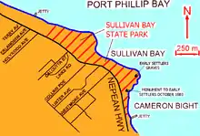 Sullivan Bay lies 60 km due south of Melbourne on Port Phillip, one kilometre east of Sorrento, Victoria. It was established as a short-lived convict settlement in 1803 by Lieutenant-Colonel David Collins,[1] who named the bay after the Under-Secretary of State for War and the Colonies, John Sullivan.