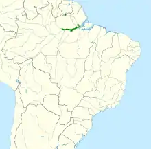 Following the realisation that the sulphur-breasted parakeet was a valid species, the first records of living birds were from east of Óbidos on the northern bank of the lower Amazon River in Pará, Brazil.[4] Since then, it has been reported more widely at low densities in the Pará state north of the Amazon River, but still no records have been reported from neighbouring parts of Amapá, where it probably also occurs.[7] Additionally, three specimens kept at the National Museum of Natural History in the Netherlands have been identified as this species. They were taken from the Sipaliwini savanna in southern Suriname. Recent sightings from the same region have also been identified as sulphur-breasted parakeets.[8] This suggests that it possibly comes into contact with the closely related and very similar sun parakeet. Unlike adult sun parakeets, sulphur-breasted parakeets have clear green suffusion to the mantle, wing-coverts and underparts, but this is shared with juvenile sun parakeets.[4] Adults of both species have a dark greyish eye ring in the wild,[9][10] but this commonly fades to whitish in captives, at least in the sun parakeet (this is the source of the mistaken idea that the colour of the eye ring separates the two).